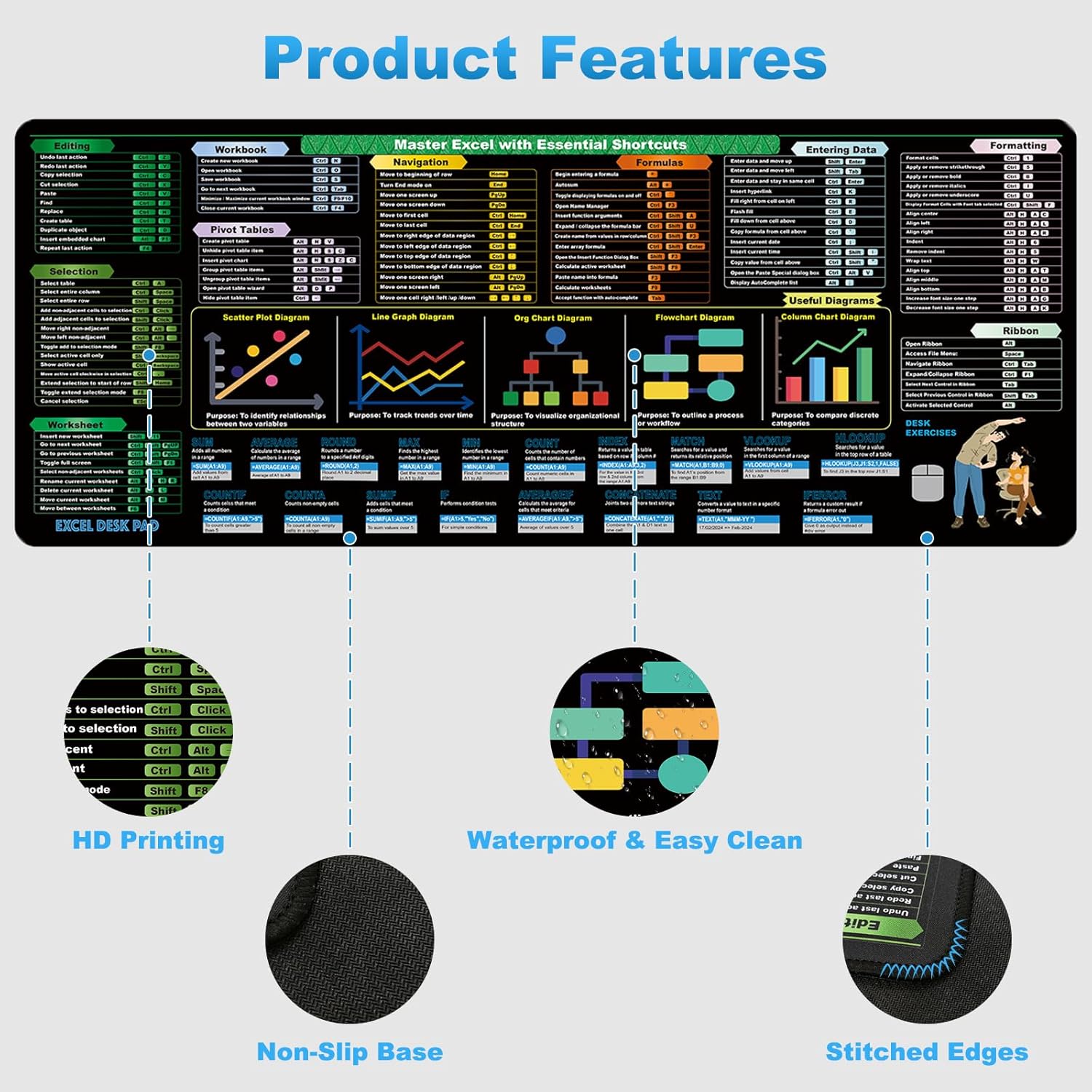 Crafted with precision and durability in mind, this desk pad is designed with stitched edges to prevent fraying and ensure long-lasting use. Say goodbye to flipping through endless pages of Excel manuals – with this cheat sheet desk pad, all the information you need is right in front of you.